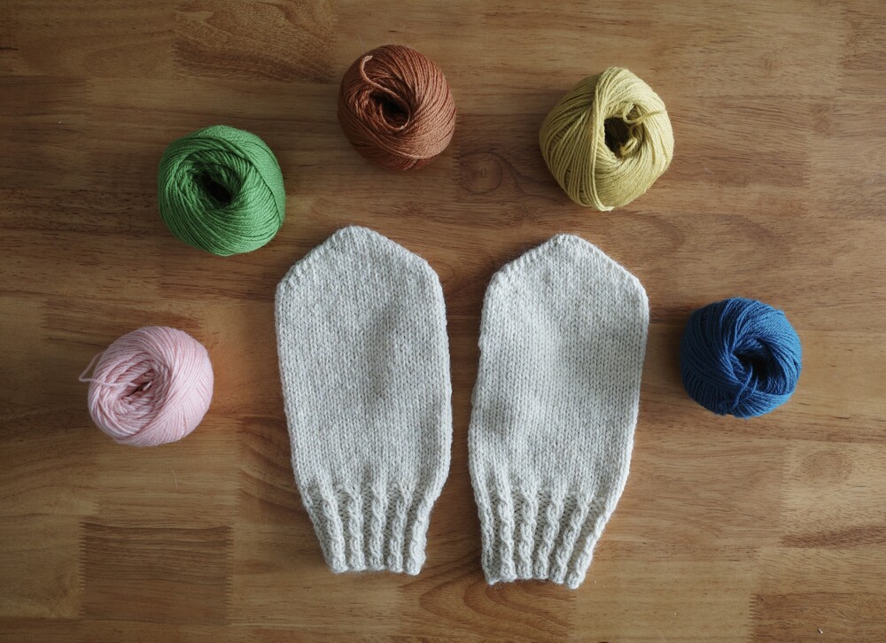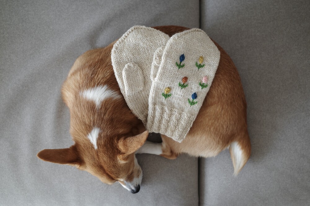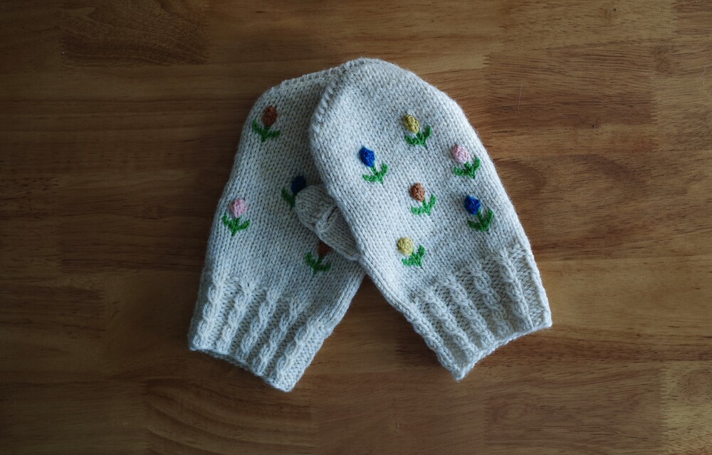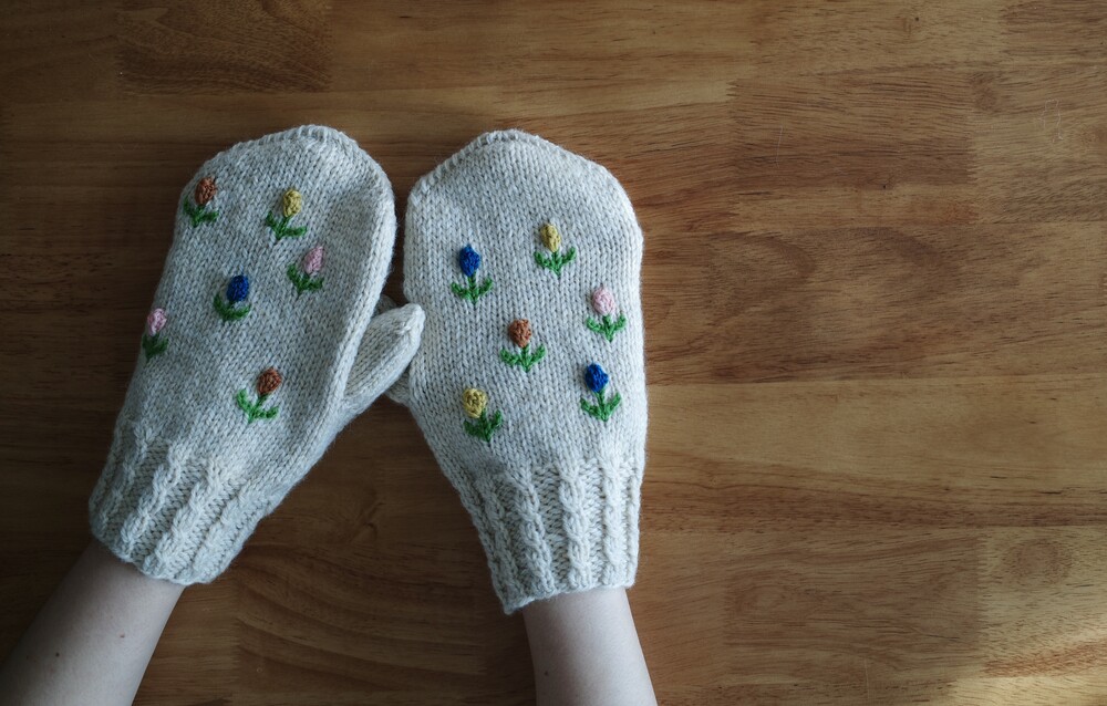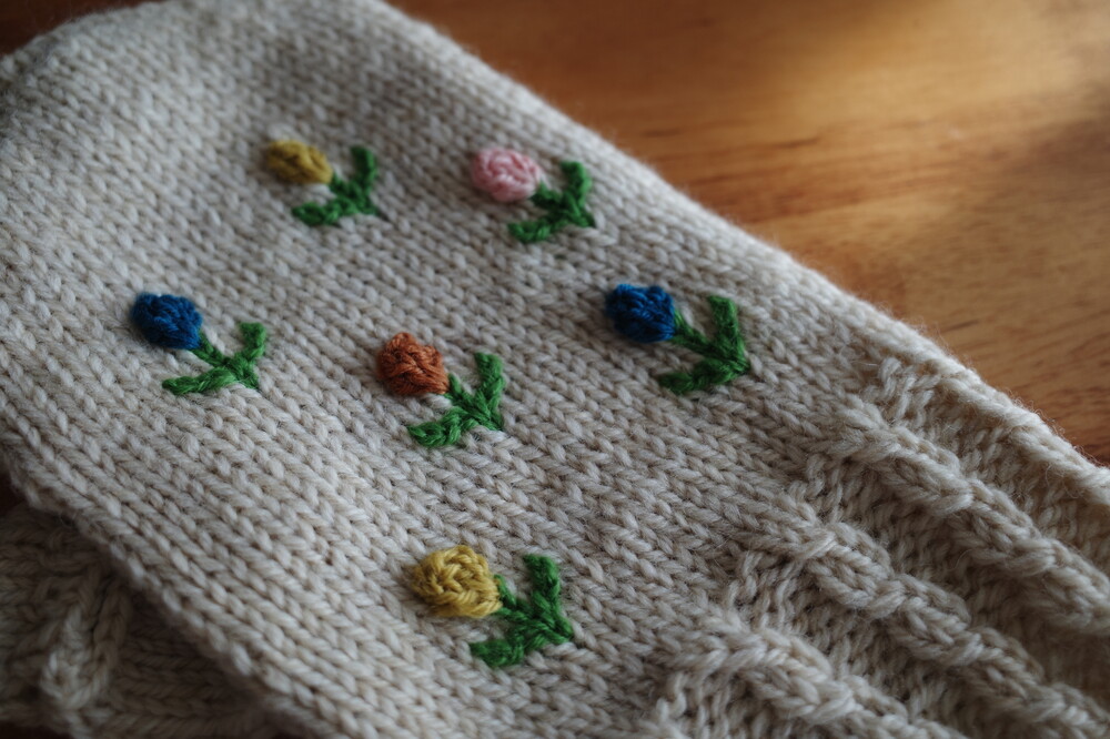 장갑을 다 뜨신 후 자수 및 코바늘로 꽃들을 심어주게 되는데요.